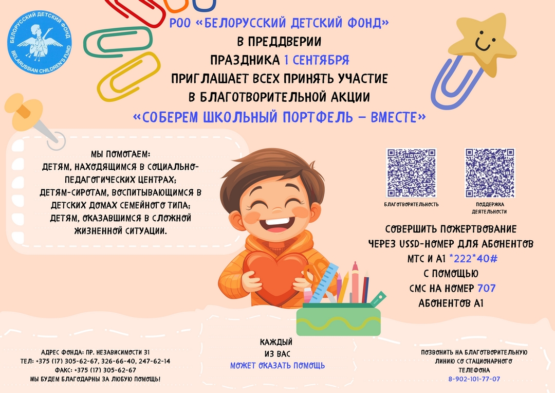 С 1 августа по 10 сентября проходит акция «Соберем школьный портфель – вместе». Чтобы помочь подготовиться к школе детям из социально-педагогических центров, воспитанникам детских домов семейного типа, а также тем, кто оказался в трудной жизненной ситуации, Белорусский детский фонд предлагает всем неравнодушным присоединиться к акции и подарить частичку своего тепла тем, кто в этом действительно нуждается.