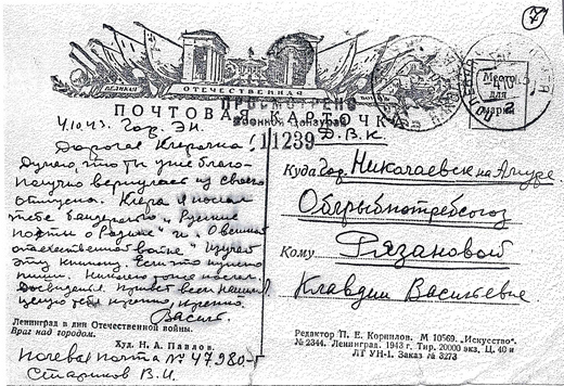 «… Получив эту карточку покажи ее всем твоим знакомым… расскажи, как фашистские гады воюют и с кем. Как они бьют из тяжелых орудий по городу, бомбят, душили тисками голода, холода, кольцом блокады, заверяя весь мир, что они истребляют только военные объекты и Красную Армию. Но мы знаем что за военные объекты они разрушают, что за бойцов они истребляют. Вот, бедный, маленький, ни в чем неповинный ребенок, который пострадал от фашистских гадов,…. извергов, порождения дьяволов. За что? Спрашивает он невинный. Клёра, ненавижу врага всеми фибрами души и призываю к этому всех друзей, знакомых. Помогайте стране, фронту своей работой…. Агитируй за ненависть к врагу, агитируй везде, в печати и в личной беседе».