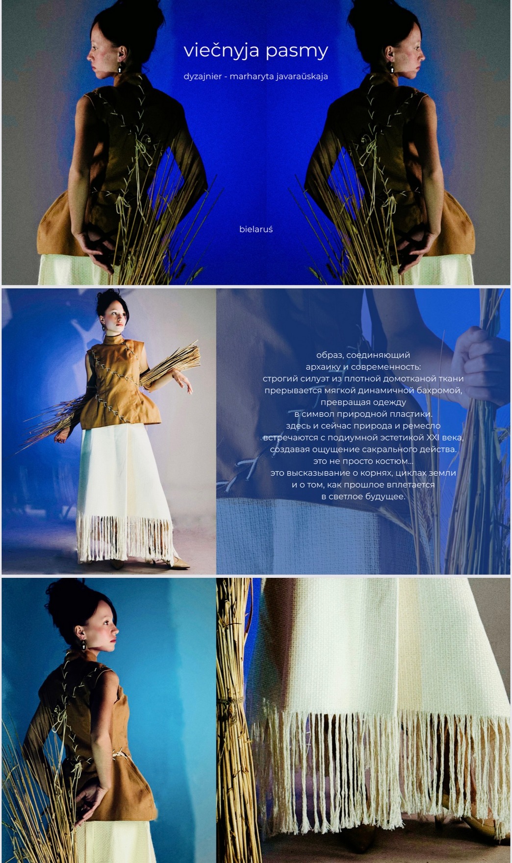 «viečnyja pasmy» — образ, соединяющий архаику и современность: строгий силуэт из плотной домотканой ткани прерывается мягкой динамичной бахромой, превращая одежду в символ природной пластики. Здесь и сейчас природа и ремесло встречаются с подиумной эстетикой XXI века создавая ощущение сакрального действа это не просто костюм... Это высказывание о корнях, циклах земли и о том, как прошлое вплетается в светлое будущее!» — рассказывает Маргарита Еваровская