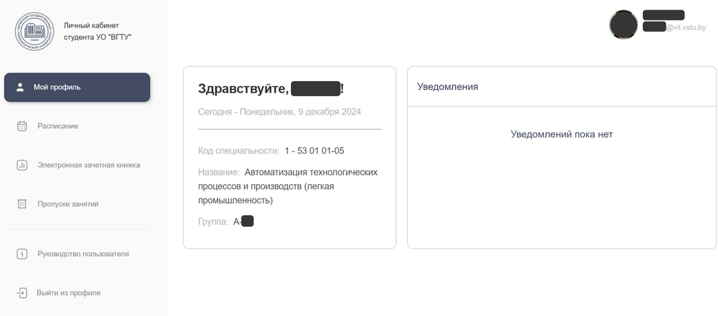 В открывшемся окне, отображаются данные о студенте (фото, ФИО, код специальности, номер группы), окно уведомлений и доступ к сервисам.