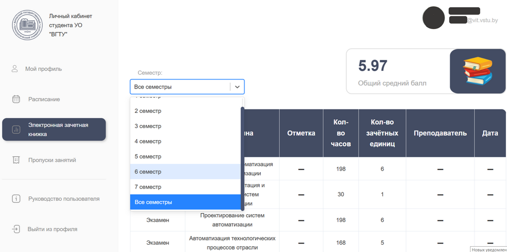 В верхнем правом углу указан текущий средний бал зачетки.