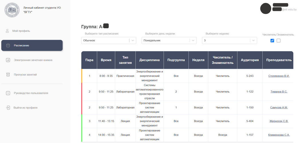 По умолчанию расписание выводится на текущую дату (с учетом номера недели и ее типа). В окне выбора дня можно выбрать другой день недели или полное расписание на неделю.