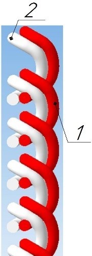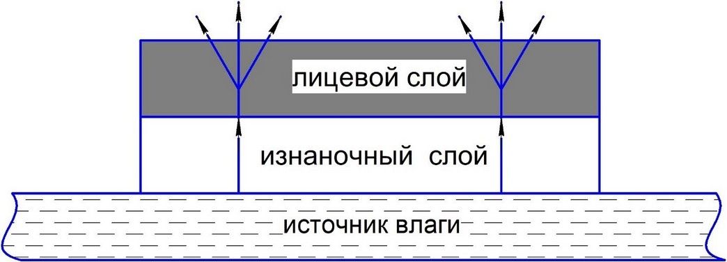 Внутренний изнаночный прилегающий к телу слой 2 состоит из гидрофобных (не впитывающих влагу) синтетических нитей. Эти нити, преимущественно мультифиламентные, не впитывая влагу, передают ее во внешний лицевой испаряющий слой 1, сформированный из гидрофильных нитей. С внешнего испаряющего слоя влага передается в окружающее пространство. Таким образом, создается «эффект сухости» изделия в условиях повышенного потоотделения.
