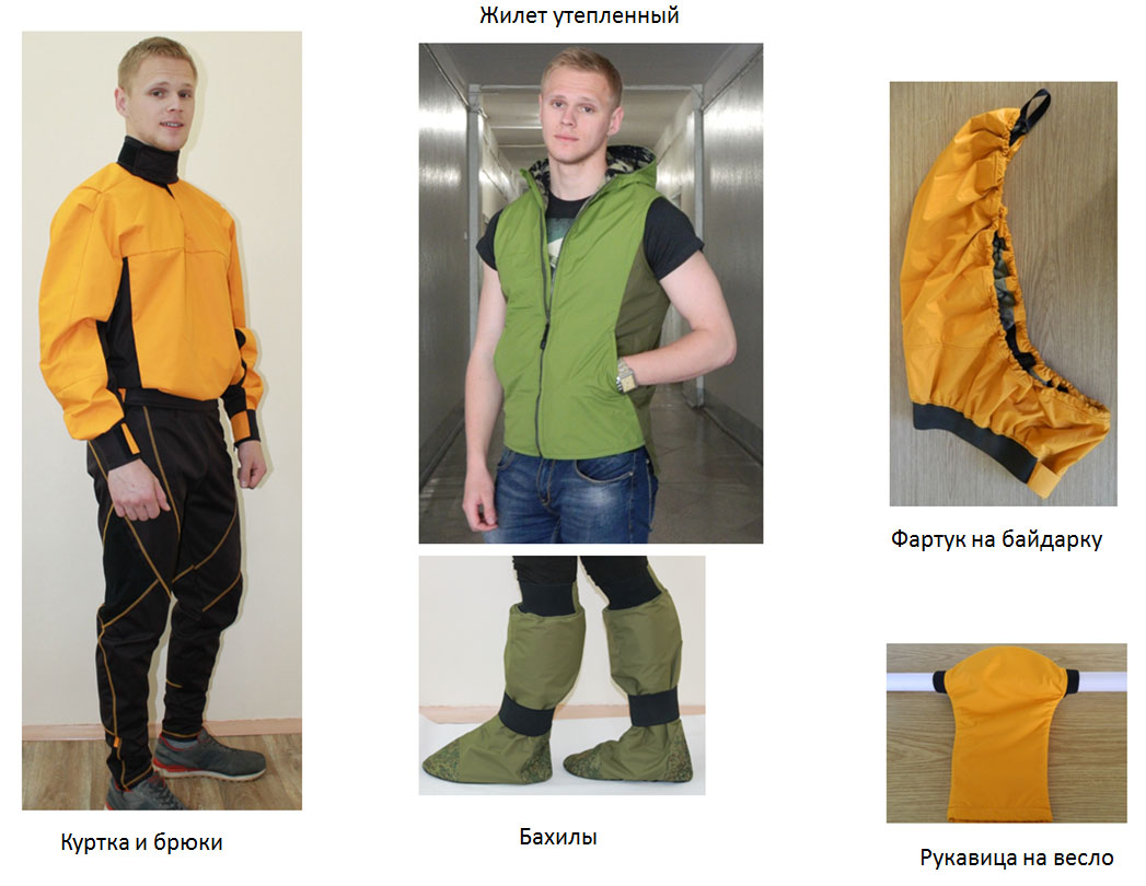 В состав комплекта входит куртка, брюки, брюки утепленные, жилет утепленный, бахилы водозащитные, рукавицы байдарочника, фартук на байдарку водозащитный утепленный.