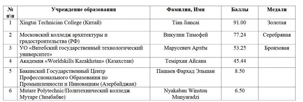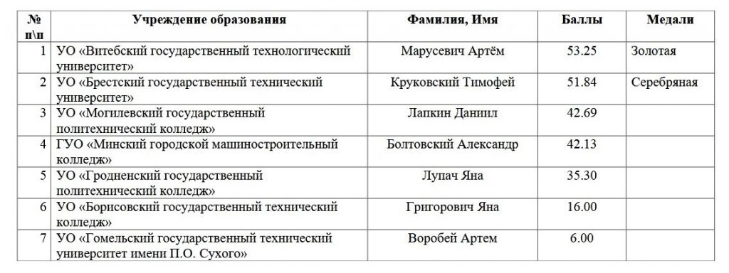 В белорусском зачете данной компетенции соревновались 7 участников из учреждений образования (колледжей и университетов) Витебска, Бреста, Борисова, Гомеля, Гродно, Минска и Могилева. Набрав 53,25 балла, Артём Марусевич стал первым среди белорусских участников и завоевал диплом первой степени и золотую медаль VI Республиканский конкурс профессионального мастерства Profskills Belarus 2025.
