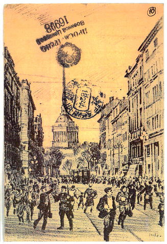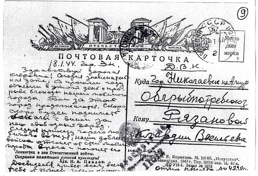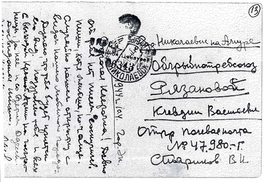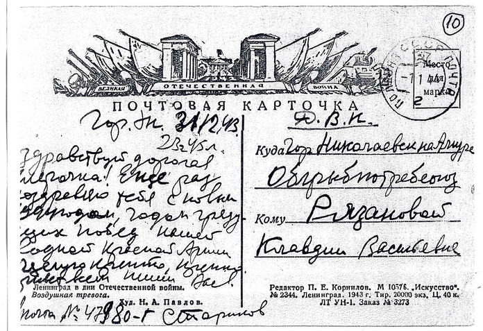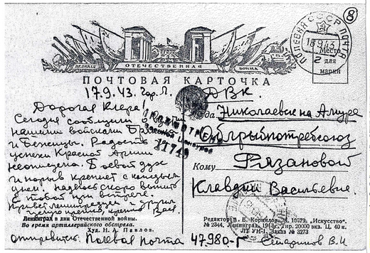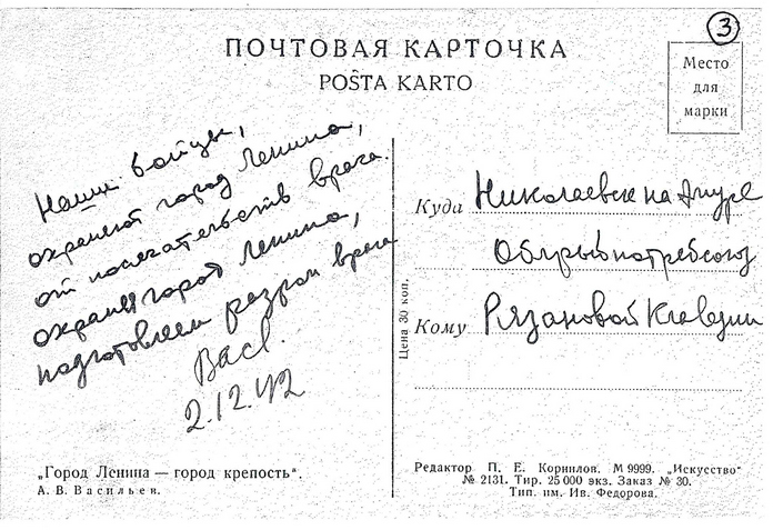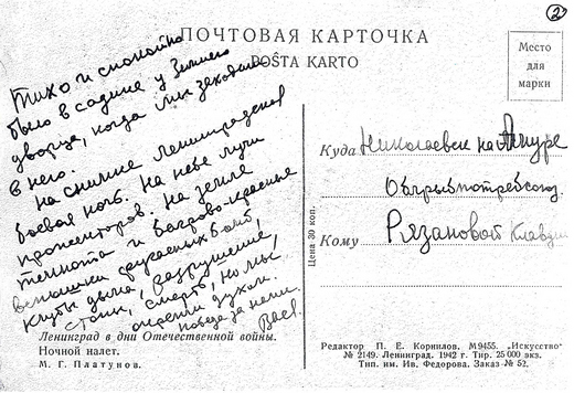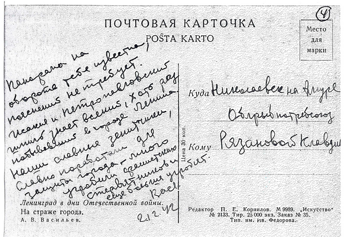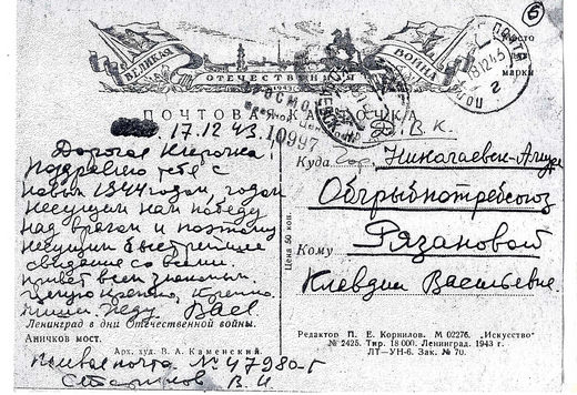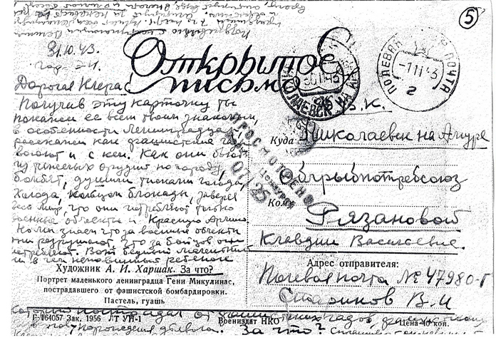 «… Получив эту карточку покажи ее всем твоим знакомым… расскажи, как фашистские гады воюют и с кем. Как они бьют из тяжелых орудий по городу, бомбят, душили тисками голода, холода, кольцом блокады, заверяя весь мир, что они истребляют только военные объекты и Красную Армию. Но мы знаем что за военные объекты они разрушают, что за бойцов они истребляют. Вот, бедный, маленький, ни в чем неповинный ребенок, который пострадал от фашистских гадов,…. извергов, порождения дьяволов. За что? Спрашивает он невинный. Клёра, ненавижу врага всеми фибрами души и призываю к этому всех друзей, знакомых. Помогайте стране, фронту своей работой…. Агитируй за ненависть к врагу, агитируй везде, в печати и в личной беседе».