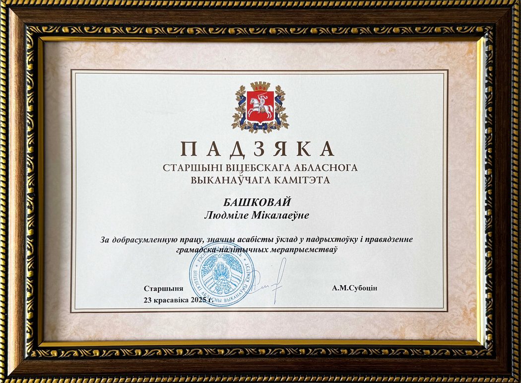 Людмила Николаевна Башкова удостоена Благодарственного письма Президента Республики Беларусь. Сотрудники ВГТУ также отмечены Благодарственными письмами Центральной избирательной комиссии Республики Беларусь.