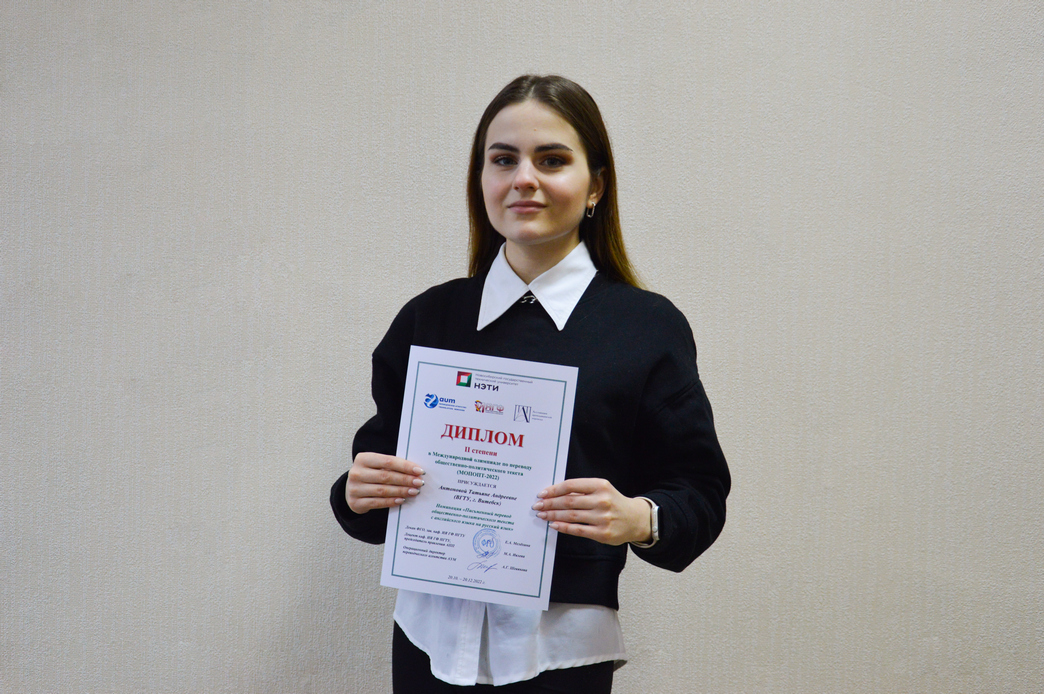 Татьяна под руководством заведующей кафедрой иностранных языков ВГТУ Светланы Степановны Костыревой успешно выдержала конкуренцию со студентами-лингвистами, в том числе переводческих специальностей, в номинации «Письменный перевод общественно-политического текста с английского языка на русский язык».